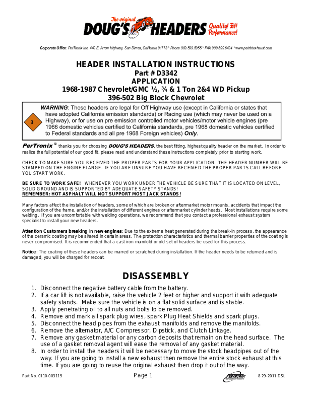 Corporate Office: PerTronix Inc. 440 E. Arrow Highway, San Dimas, California 91773 * Phone 909.599.5955 * FAX 909.599.6424 * www.patriotexhaust.com