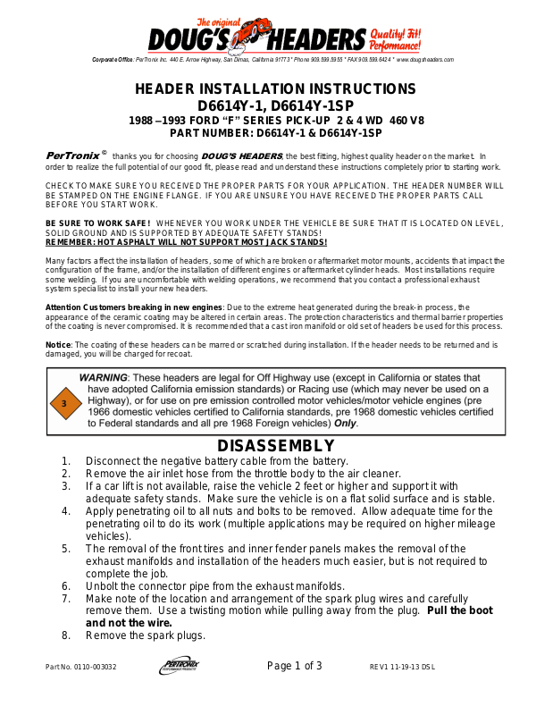 Corporate Office: PerTronix Inc. 440 E. Arrow Highway, San Dimas, California 91773 * Phone 909.599.5955 * FAX 909.599.6424 * www.dougsheaders.com