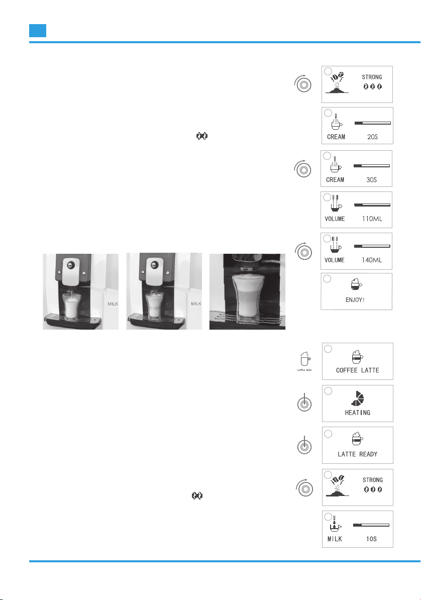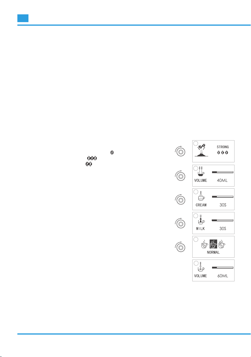 • Nastavenie sily a objemu espressa pre prípravu kávy latté a dĺžky prípravy mlieka a mliečnej peny.