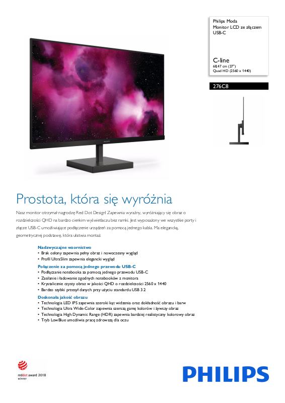 Nasz monitor otrzymał nagrodzę Red Dot Design! Zapewnia wyraźny, wyróżniający się obraz o