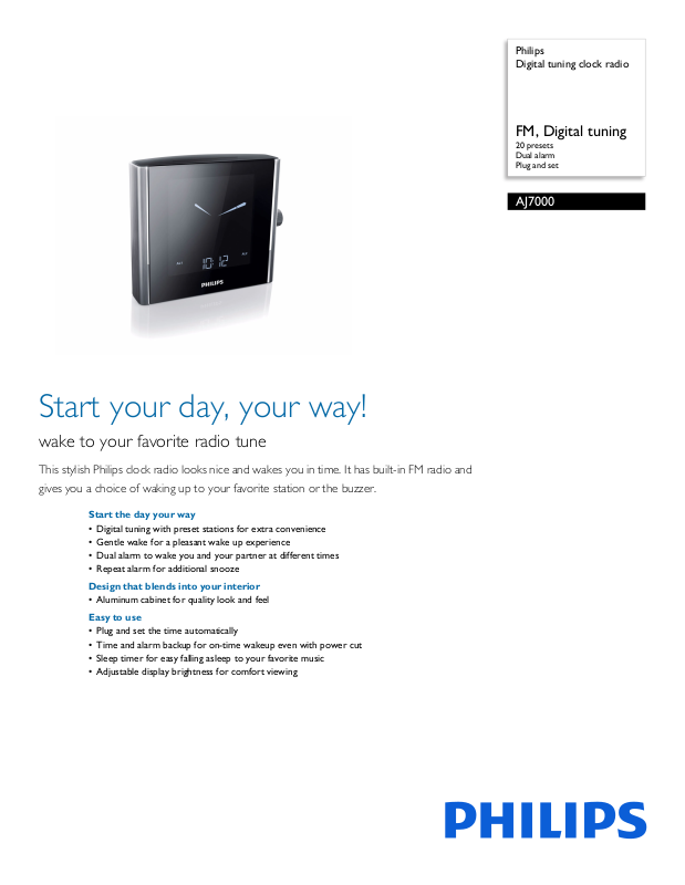 This stylish Philips clock radio looks nice and wakes you in time. It has built-in FM radio and