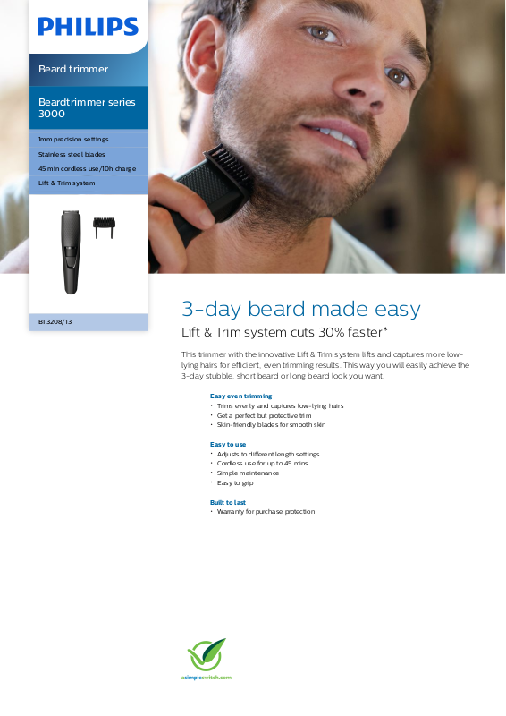 This trimmer with the innovative Lift & Trim system lifts and captures more lowlying hairs for efficient, even trimming results. This way you will easily achieve the