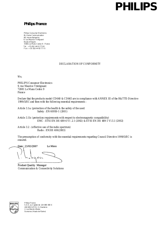 Declare that the products model CD640 & CD645 are in compliance with ANNEX III of the R&TTE-Directive