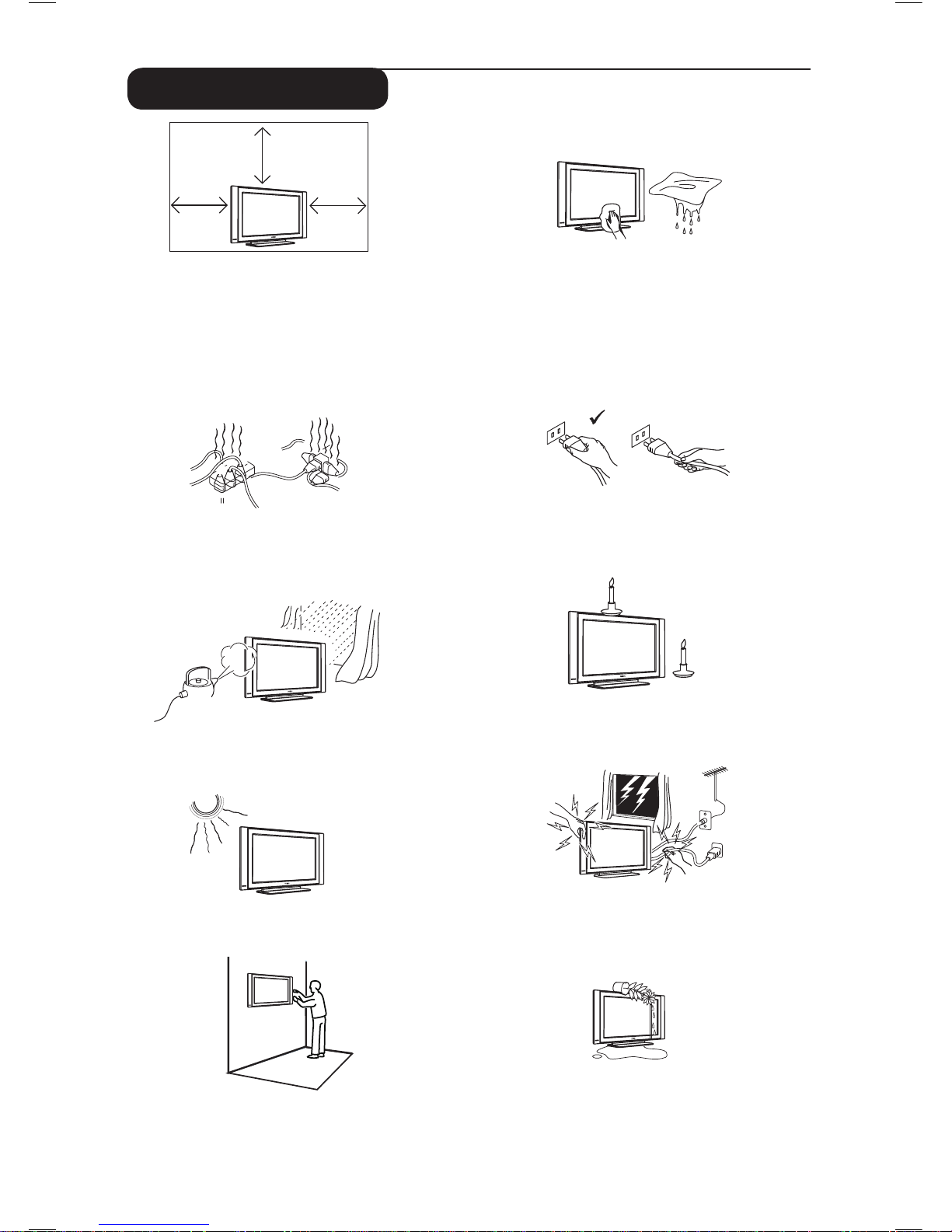 For the best results, choose a position where light does not fall directly on the screen,and at some distance away from radiators or other sources of heat. Leave a space of at least 5 cm all around the TV for ventilation, making sure that curtains, cupboards etc. cannot obstruct the air flow through the ventilation apertures.The TV is intended for use in a domestic environment only and should never be operated or stored in excessively hot or humid atmospheres.
