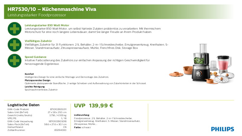 Foodprozessor, 2.1L Behälter, 2-in-1 Schneidescheibe,