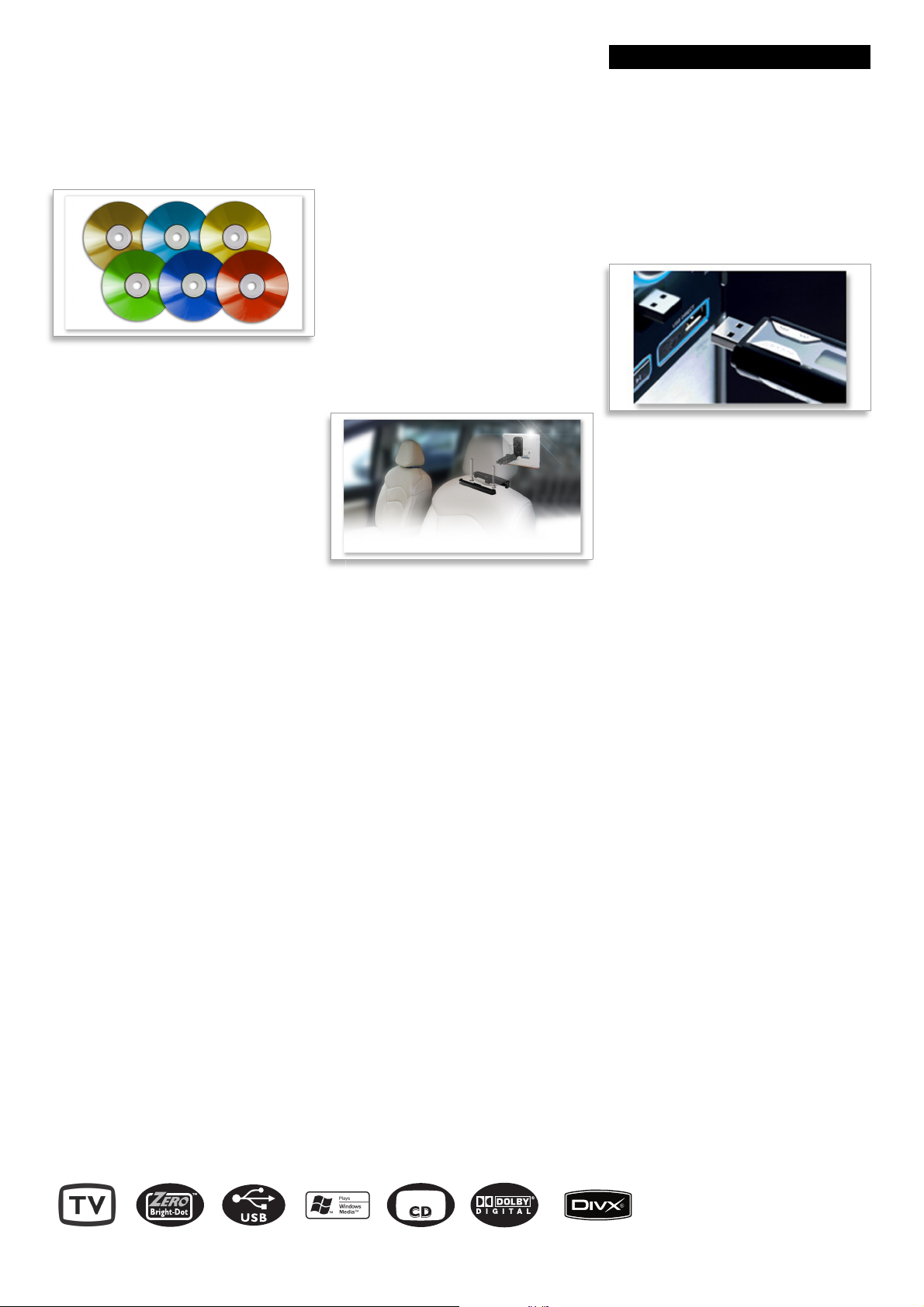 • Фильмы DVD, DVD+/-R и DVD+/-RW, (S)VCD, DivX® и MPEG4