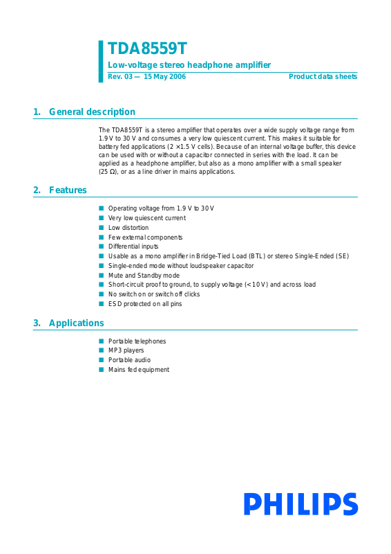 The TDA8559T has a voltage supply range from 1.9 V to 30 V. This range is divided over