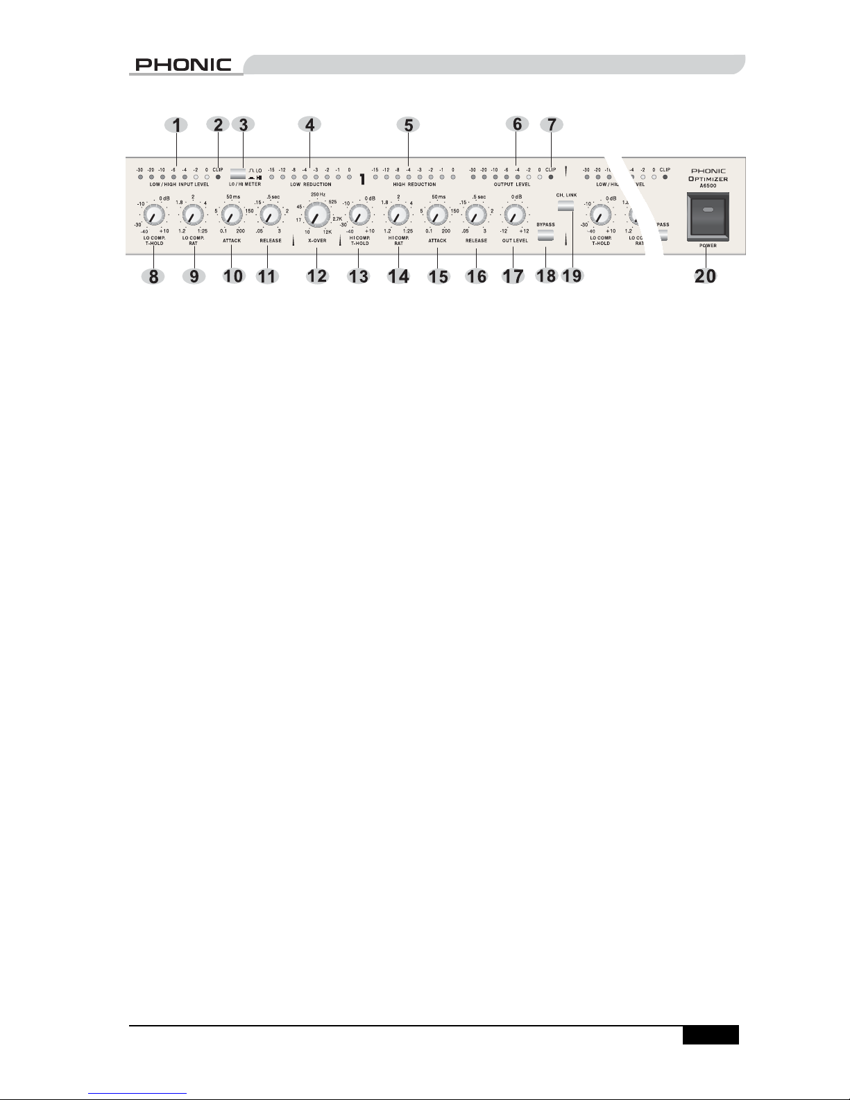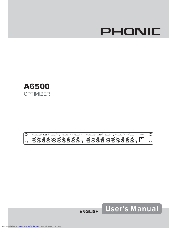 Thank you for choosing a Phonic professional audio product. The A6500 OPTIMIZER is a new generation two-channel audio compressor featuring dual-band controls with variable crossover frequency. Each band has its own independent controls for compression threshold, ratio, and attack time. The LED meters provide immediate display of the input, output, and gain reduction levels. A bypass switch in each channel allows quick comparison between the processed and unprocessed signals. The LINK option allows simultaneous control of both channels.