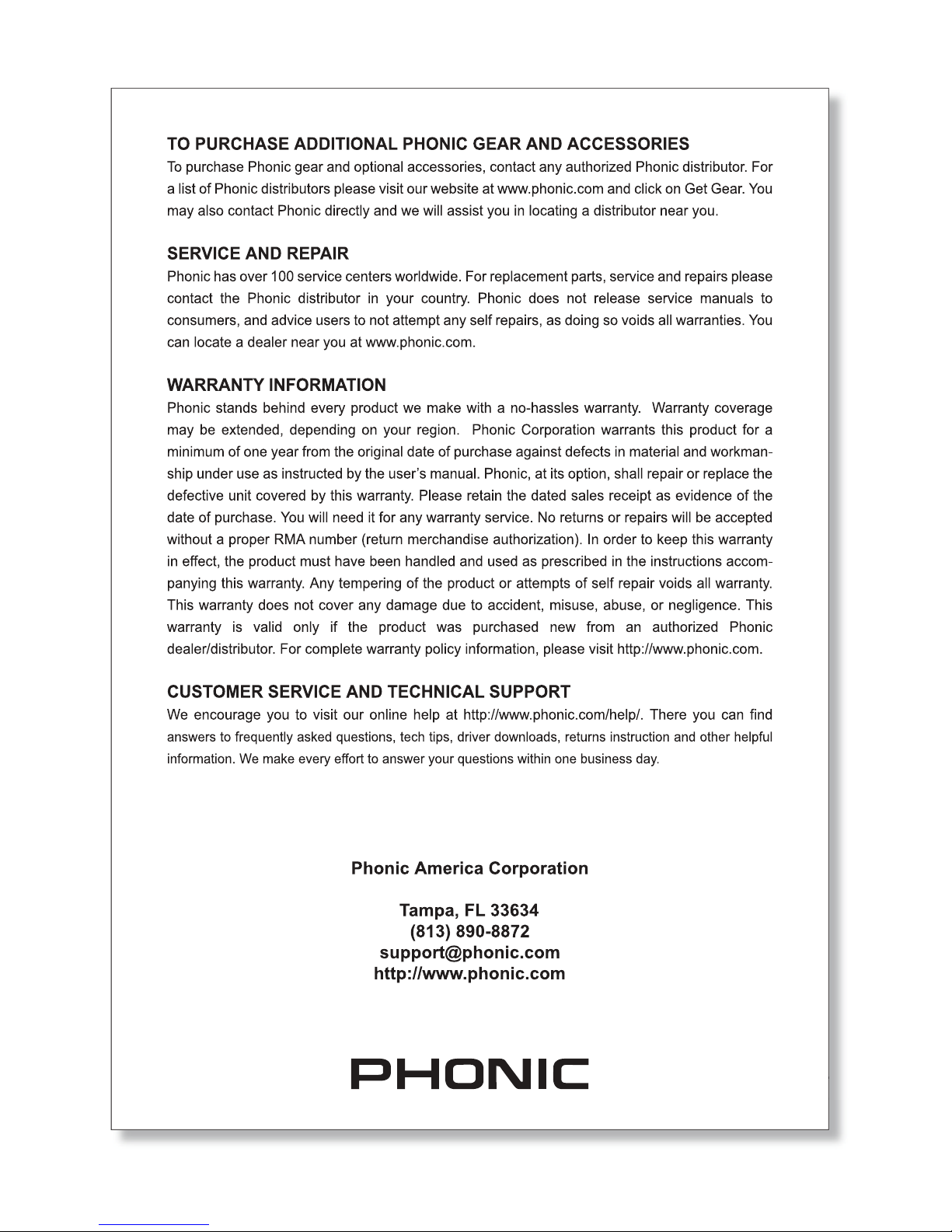 This manual is designed to be both concise and comprehensive. It is concise, so you can quickly start using your new gear. It is also comprehensive, so you can gain a full understanding of the fi ne equipment that you have just purchased. We hope you will soon discover that you have made a wise investment in buying a Phonic product.