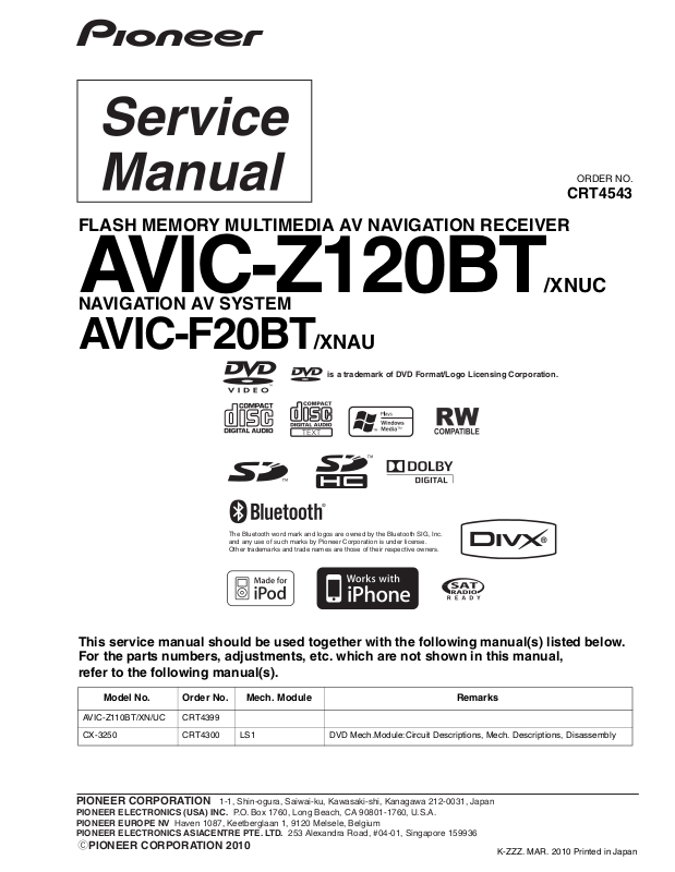 Mark No. Description AVIC-Z110BT/XN/UC AVIC-Z120BT/XNUC AVIC-F20BT/XNAU