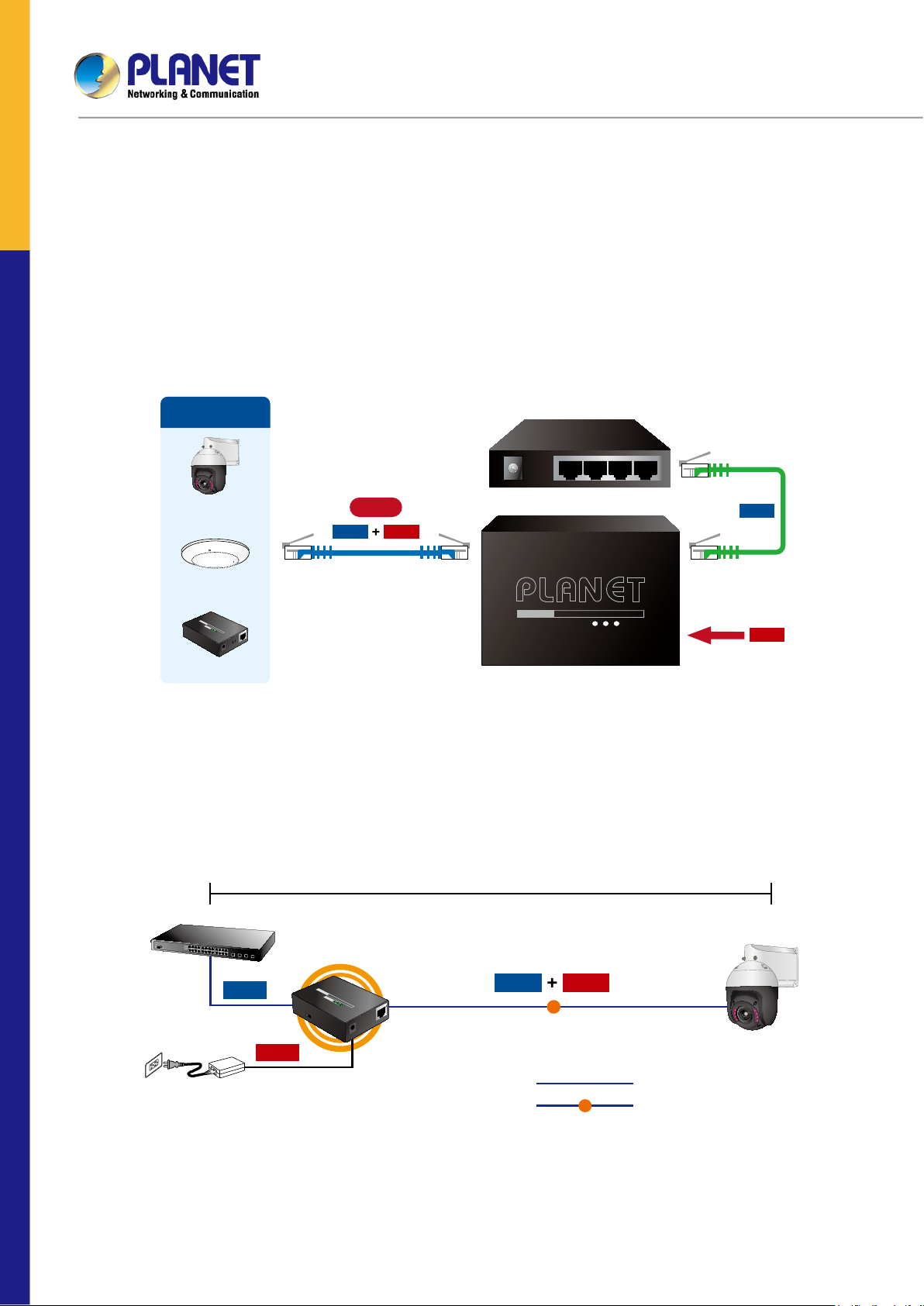 devices which need high power input, such as PTZ (Pan, Tilt & Zoom) network cameras, PTZ speed dome, color touch-screen Voice over IP (VoIP)