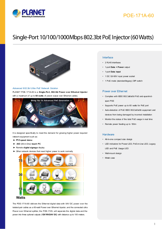 Backward compatible with both 802.3af/at PoE standards, the POE-171A-60 allows users to flexibly deploy standard and high powered devices to transfer
