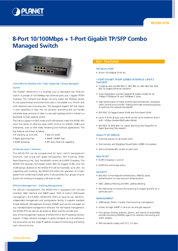 management, the PLANET WGSD-910 offers an easy-to-use, platform-