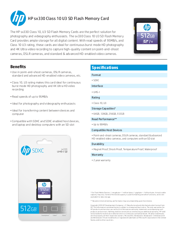 The HP sx330 Class 10, U3 SD Flash Memory Cards are the perfect solution for
