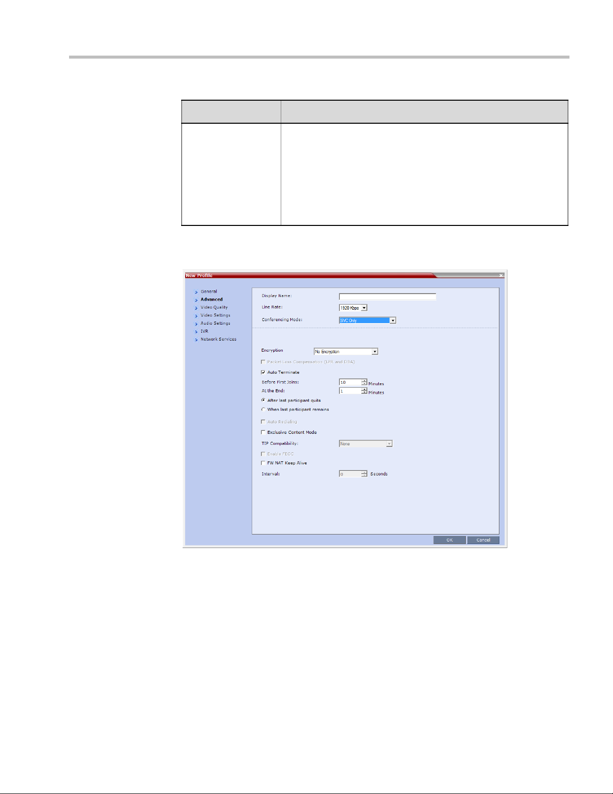 The H.264 Cascade and SVC Optimized option uses fixed resolution and frame rate for SVC Only and mixed CP and SVC conferences. In AVC CP conferences, each content Line Rate