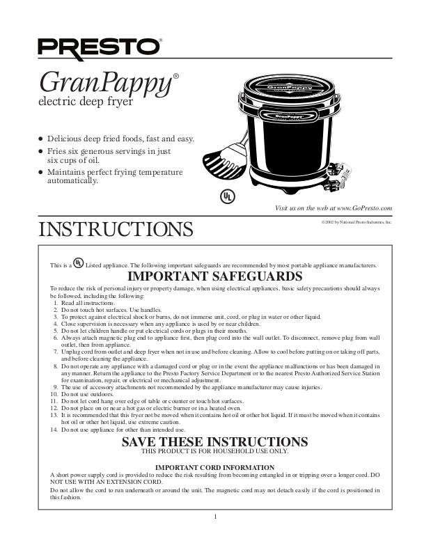We want you to obtain maximum enjoyment from using this PRESTO® appliance and ask that you read and follow the instructions enclosed. Failure to follow instructions, damage caused by improper replacement parts, abuse or misuse will void