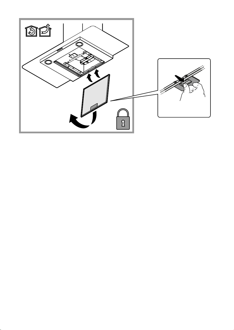 Montage : Accrochez le filtre au charbon actif d'abord sur l'arrière, à la patte métallique de la hotte, puis sur l'avant avec les deux boutons à molette.