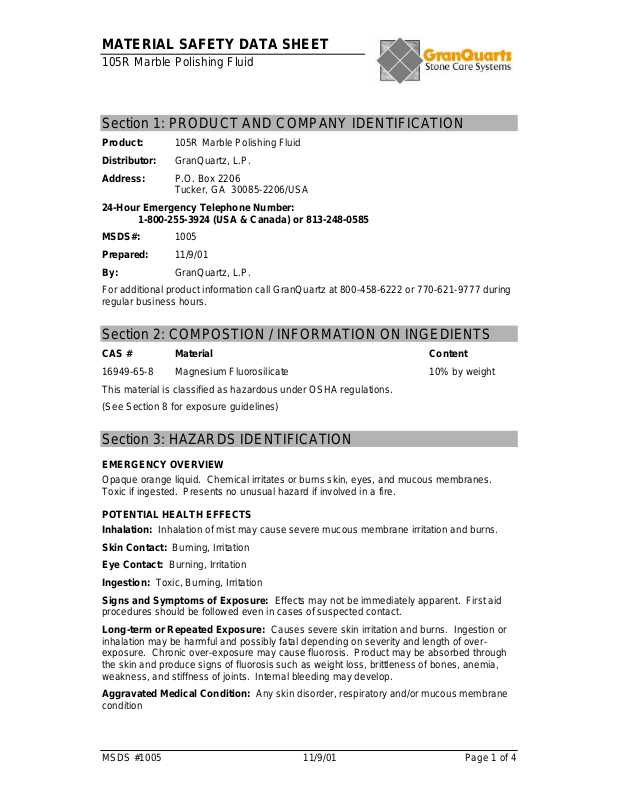 Proper Shipping Name: Fluorosilicates, n.o.s. (Magnesium Fluorosilicate)