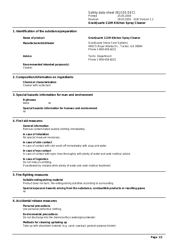 Name of product GranQuartz 111M Kitchen Spray Cleaner