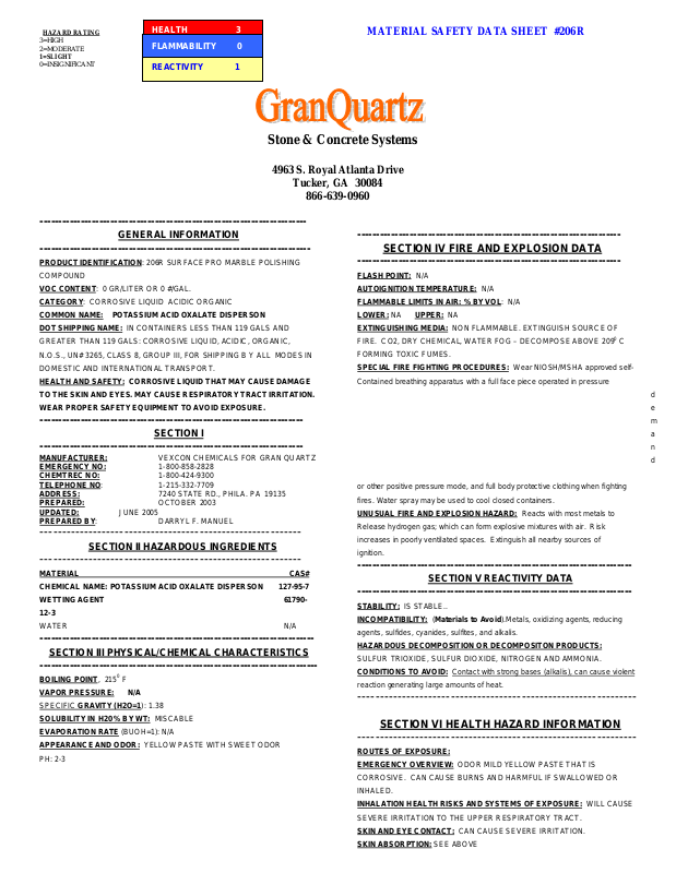 PRODUCT IDENTIFICATION: 206R SURFACE PRO MARBLE POLISHING