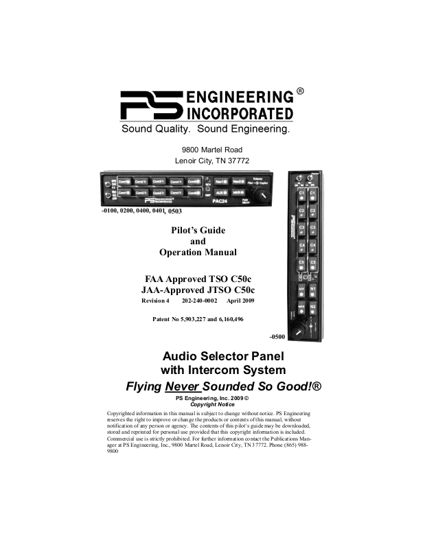 Commercial use is strictly prohibited. For further information contact the Publications Manager at PS Engineering, Inc., 9800 Martel Road, Lenoir City, TN 37772. Phone (865) 9889800