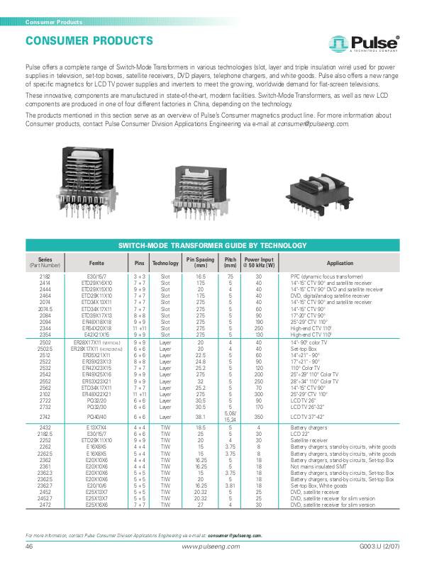 Consumer products, contact Pulse Consumer Division Applications Engineering via e-mail at