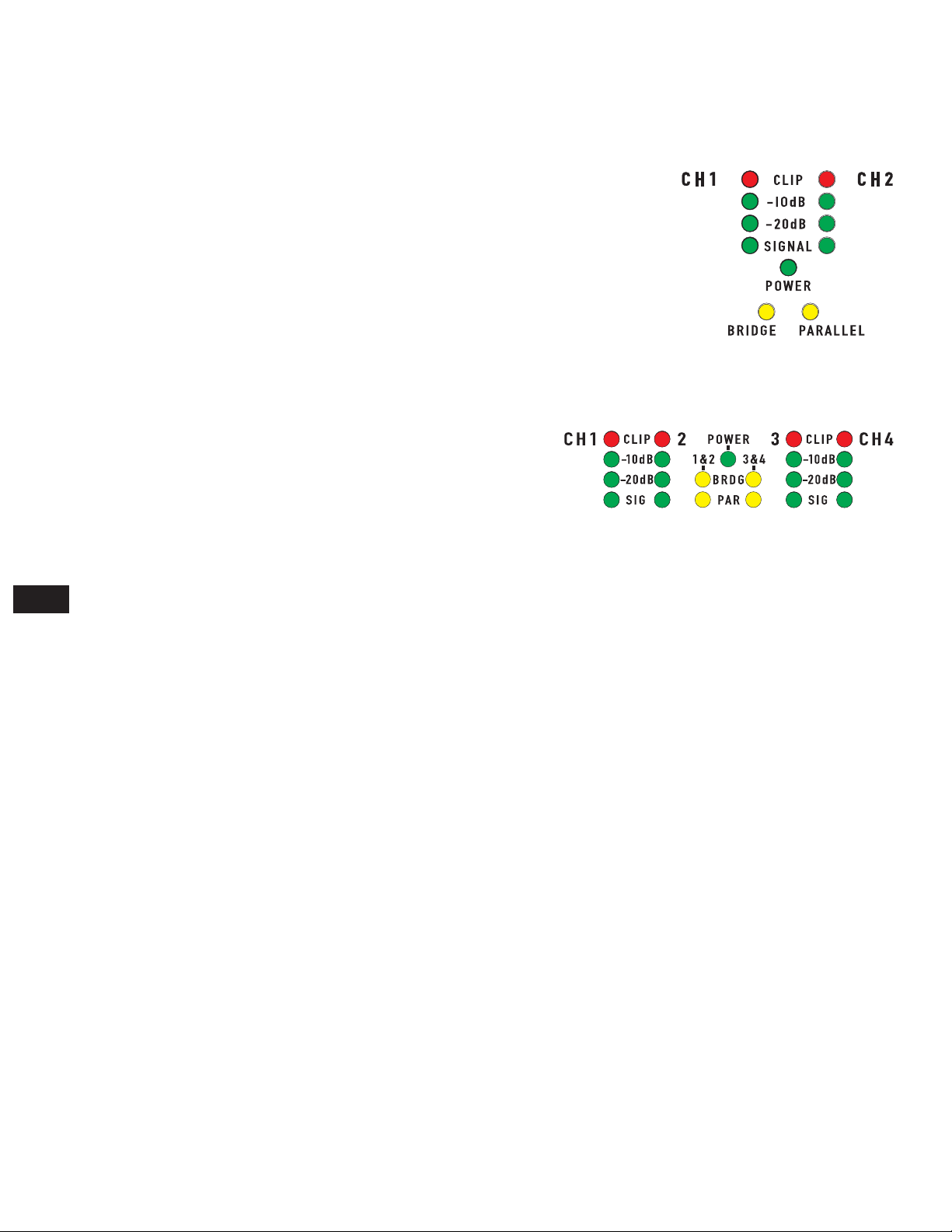 • LED indicators for power, parallel or bridge mode, input signal presence, -20dB, -10dB, and clip/protect