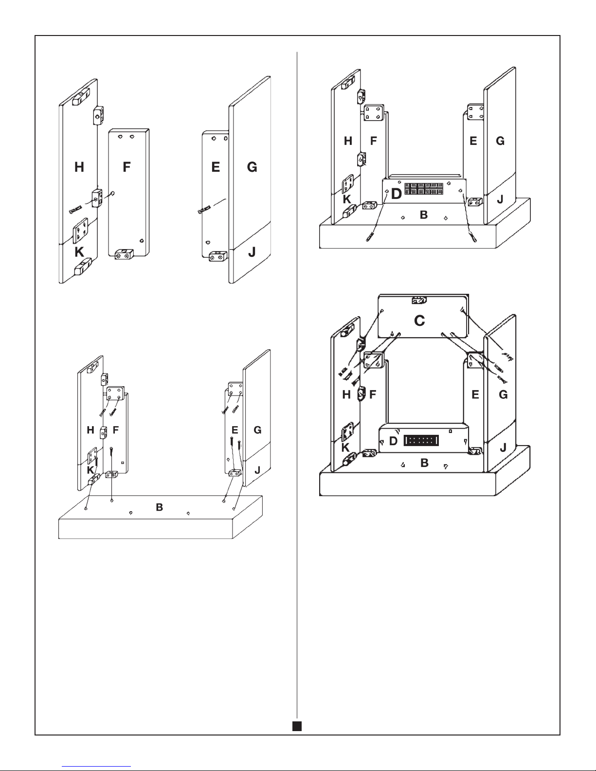 Step 2: Attach panel E to panel G and J with 1 KD screw. Attach panel F to panel H and