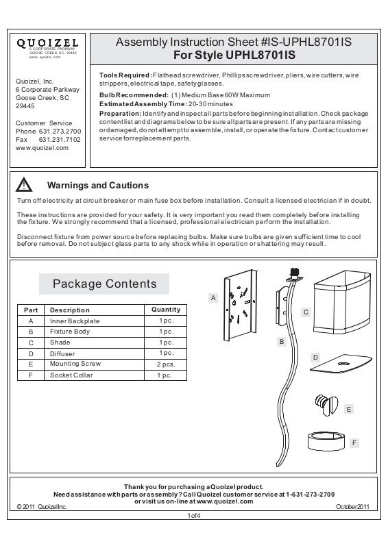 Need assistance with partsor assembly? Call Quoizelcustomer service at 1-631-273-2700