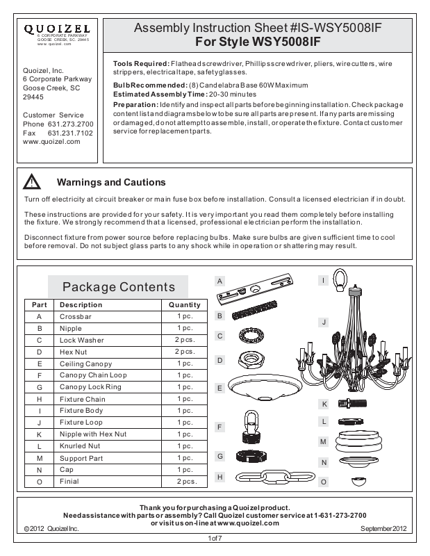 Need assistance with parts or assembly? Call Quoizel customer service at 1-631-273-2700