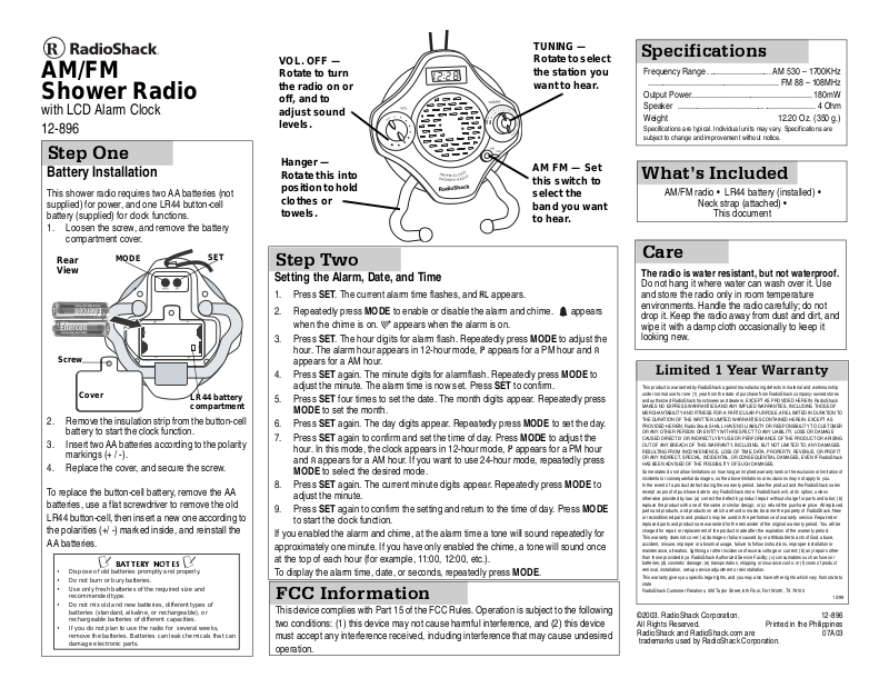 receipt as proof of purchase date to any RadioShack store. RadioShack will, at its option, unless