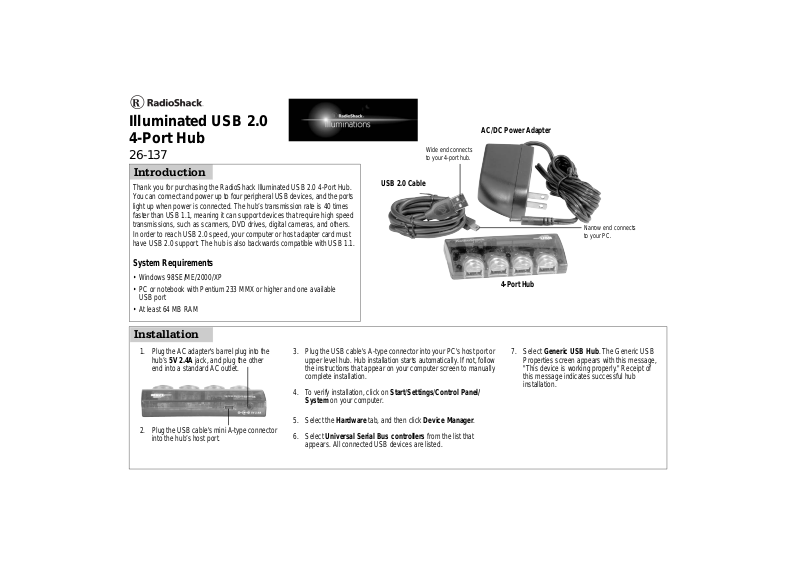 Thank you for purchasing the RadioShack Illuminated USB 2.0 4-Port Hub.