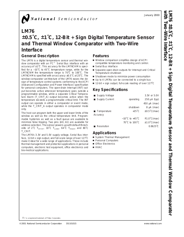 The LM76 is a digital temperature sensor and thermal window comparator with an I