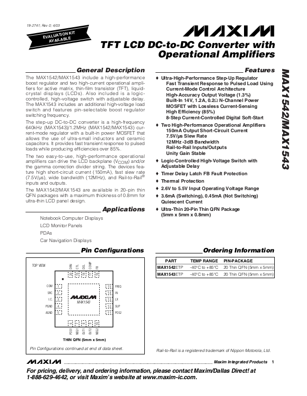 boost regulator and two high-current operational amplifiers for active matrix, thin-film transistor (TFT), liquidcrystal displays (LCDs). Also included is a logiccontrolled, high-voltage switch with adjustable delay.