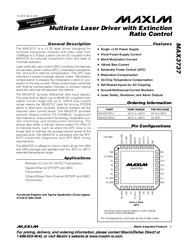 The MAX3737 is offered in a 5mm x 5mm 32-pin thin QFN