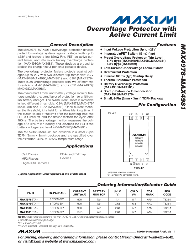 The MAX4978–MAX4981 family of devices is a combination of an overvoltage protector, overcurrent limiter,