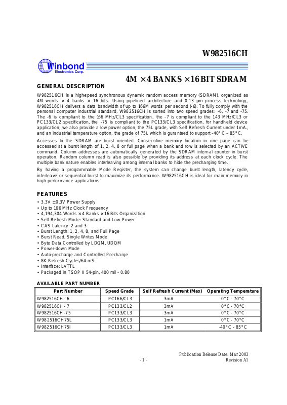 personal computer industrial standard, W982516CH is sorted into two speed grades: -6, -7 and -75.