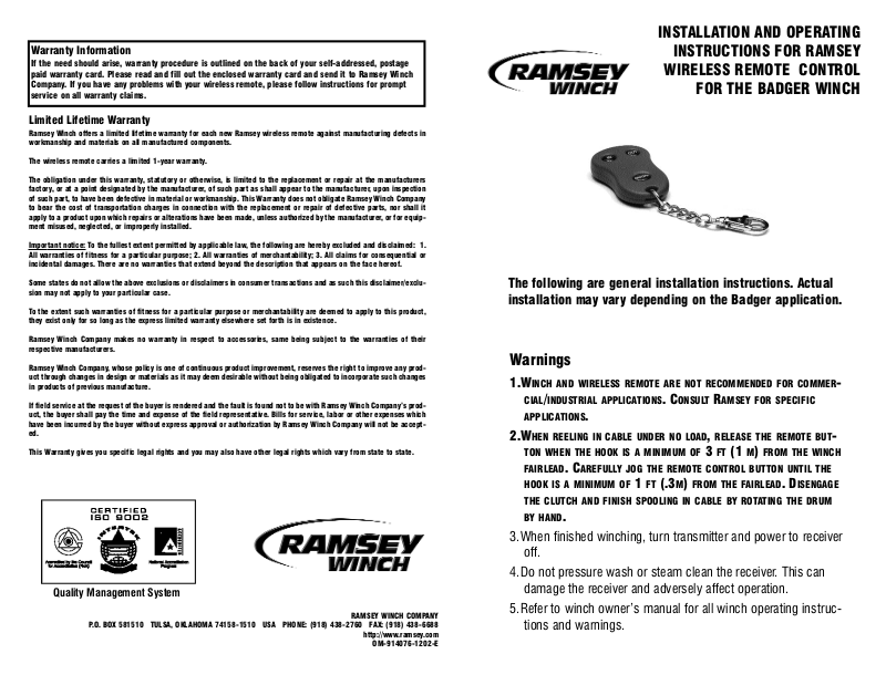 Ramsey Winch offers a limited lifetime warranty for each new Ramsey wireless remote against manufacturing defects in