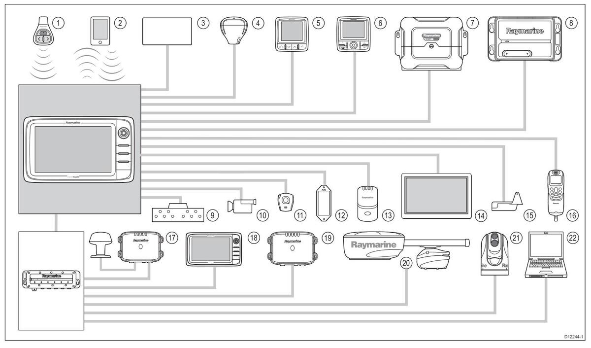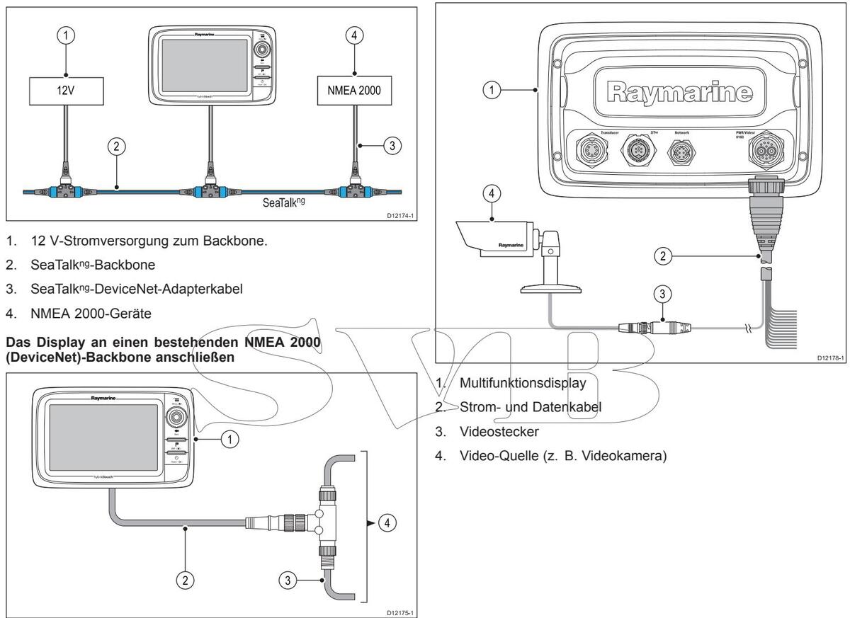 | Kapitel 3 Planung der Installation 3.1 Systemintegration 3.2 Installations-Checkliste 3.3 Systembeschränkungen 3.4 MDS (Multiple Data Sources) - Überblick 3.5 Die Variante Ihres Displays identifizieren 3.6 Netzwerkbeschränkungen 3.7 Typische Systeme 3.8 Protokolle 3.9 Datenmaster 3.10 Lieferumfang 3.11 Lieferumfang 3.12 Erforderliches Werkzeug für die Installation Kapitel 4 Kabel und Anschlüsse 4.1 Allgemeine Hinweise Verkabelung 4.2 Anschlüsse - Überblick 4.3 Stromanschluss 4.4 Netzwerkverbindungen 4.5 GPS-Anschluss 4.6 AIS-Anschluss 4.7 Fastheading-Anschlüsse 4.8 SeaTalk ng -Anschlüsse |