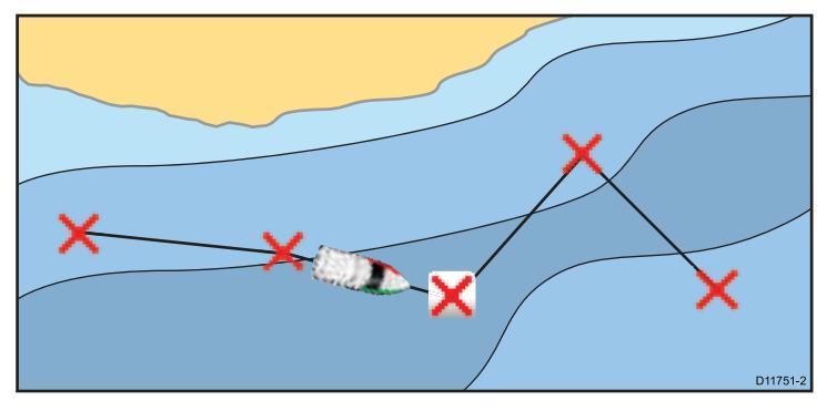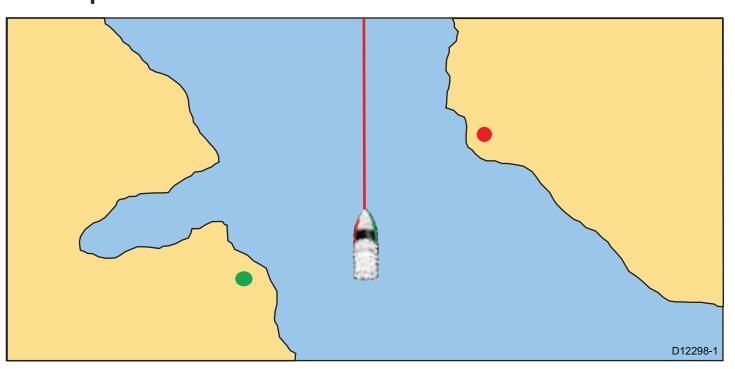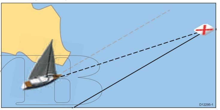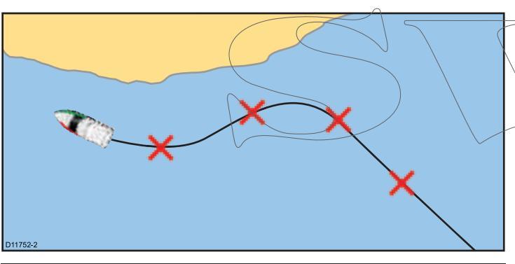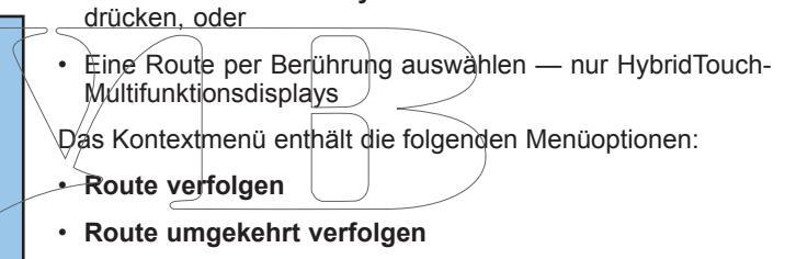 Sie können eine beliebige im Gerät gespeicherte Route verfolgen. Dabei wird jeder Wegpunkt nacheinander abgefahren. Sie können auch die Optionen zum Verfolgen einer Route zusammen mit einem kompatiblen Autopiloten benutzen, um automatisch auf Ihrer gewählte Route zu navigieren.
