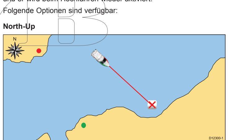 Im Head-Up-Modus wird die Karte mit Ihrem aktuellen Steuerkurs oben angezeigt. Wenn sich der Steuerkurs ändert, bleibt das Schiffssymbol fixiert und das Kartenbild dreht sich entsprechend.