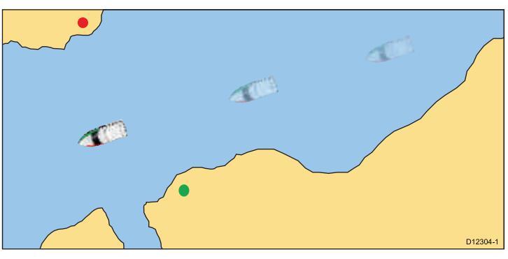Wenn Sie den Bewegungsmodus auf True Motion eingestellt haben, ist die Karte fixiert, und das Schiff bewegt sich relativ zu festen Landmassen auf dem Bildschirm. Wenn die Schiffsposition den Bildschirmrand erreicht, wird das Kartenbild automatisch