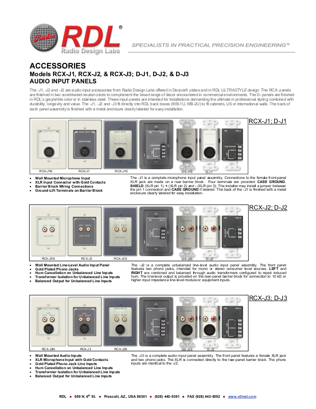 The -J1, -J2 and -J3 are audio input accessories from Radio Design Labs offered in Decora® plates and in RDL ULTRASTYLE design. The RCX- panels