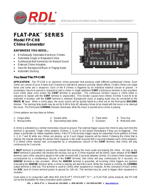 The FP-CH8 is an electronic chime generator that produces eight different synthesized chimes. Each