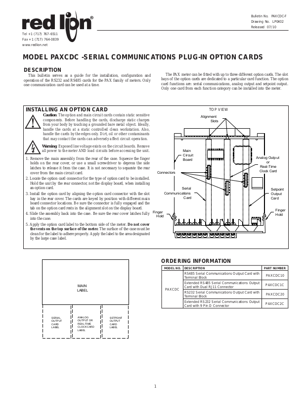 operation of the RS232 and RS485 cards for the PAX family of meters. Only