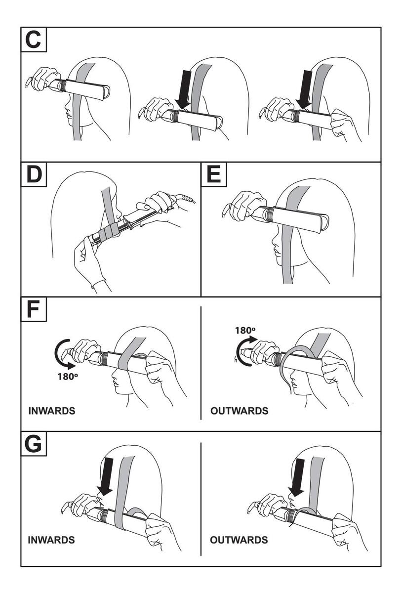 · أُمسكي المقبض بحيث يكون الطرف البارد متجهًا لأسفل ولغي قسمًا من الشعر يتراوح من 3 إلى 5 سم حول الأسطوانة (الشكل D).