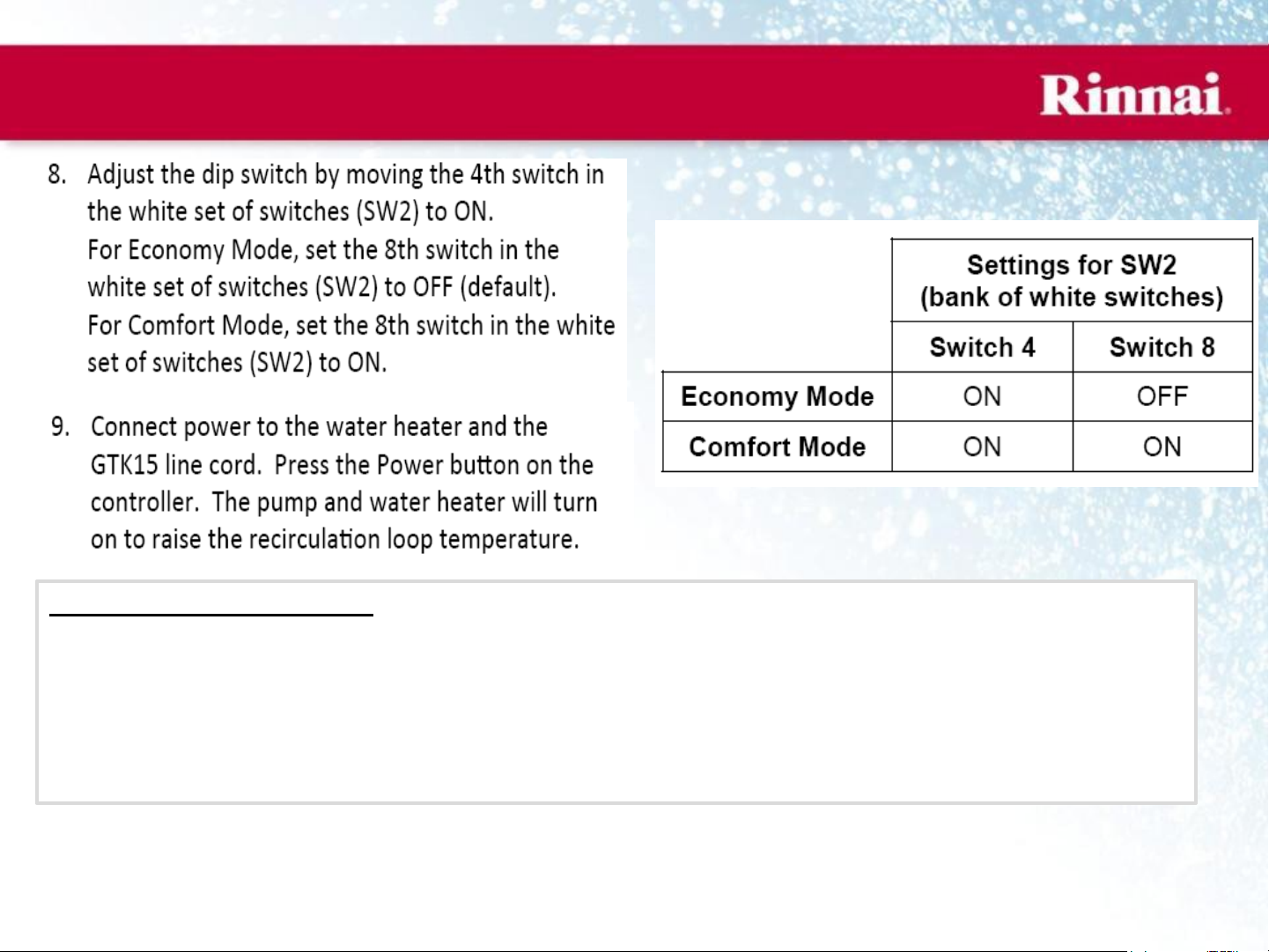 turned on. The Rinnai inlet and outlet thermistors