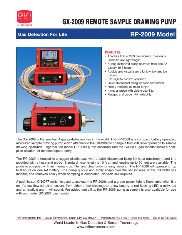 drawing operation. Together the model RP-2009 pump assembly and the GX-2009 gas monitor make a complete solution for confined space entry.