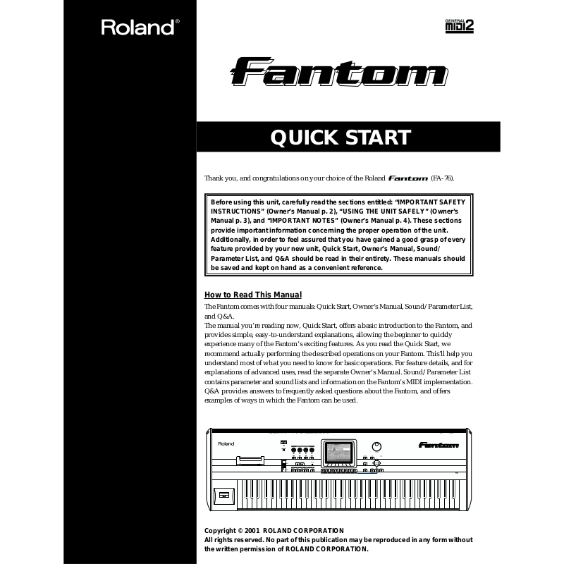 The Fantom comes with four manuals: Quick Start, Owner’s Manual, Sound/Parameter List,