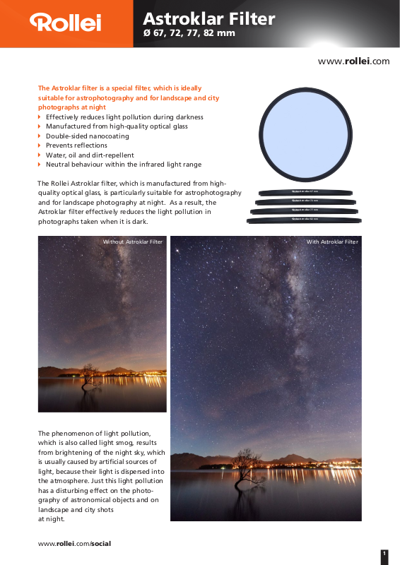 The Rollei Astroklar filter, which is manufactured from highquality optical glass, is particularly suitable for astrophotography